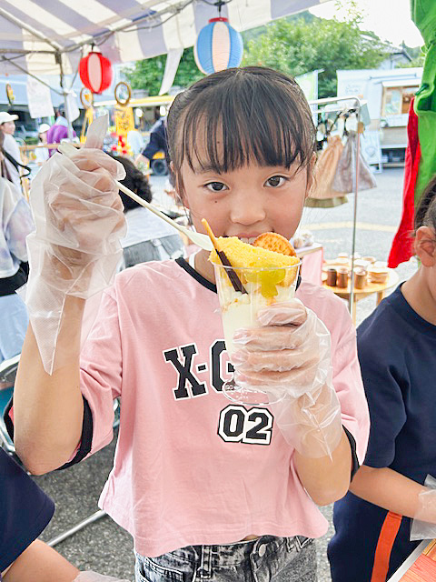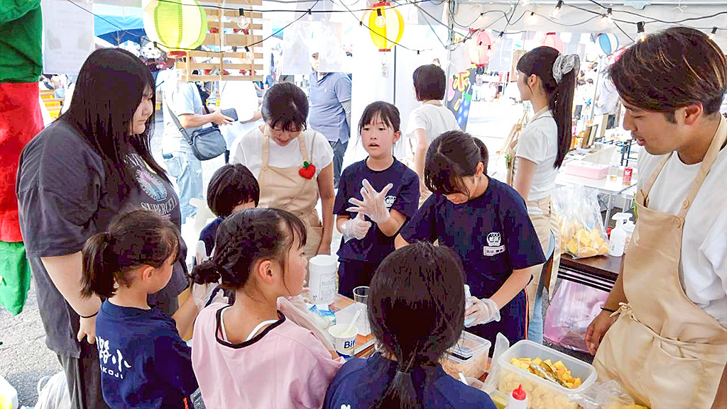 令和7年8月9日に行われた都路灯まつりにおいて、10年前に古道小学校の児童が開発したきゅうりジャムを使った料理教室を地元小中学生や地元住民の方々を対象に行いました。きゅうりジャム「都路キュウリマン」を開発・PRしてきた卒業生達が、ジャムを使用したヨーグルトパフェの作り方を教えながら、都路キュウリマンの名前の秘密を伝えたり、開発秘話を話したり、現在の小中学生のことを聞いたりしながら、世代を超えた交流を深めました。地域住民の方も多く集まり、10年前の様子を語り合ったり、震災からの復興の様子を思い出したりすることで大変有意義な機会を創出することができました。