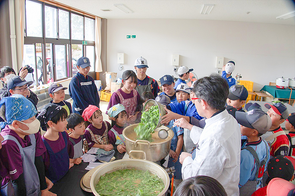 11月24日(月・祝)に野球・ソフトボール教室等を開催し、町内の小中学生を中心に多くの子どもたちが参加しました。教室では、元読売巨人軍の東野投手と和田選手が講師を務め、基礎練習の指導やプロ野球のご経験談など様々なお話もいただきました。受講した小中学生同士の親交に加え、一流選手との貴重な対話機会が提供できました。また、川俣町の美味しい地元食材を活用したアスリート飯の料理教室も開催し、バランスの取れた食事指導など親御さんも交えて未来のアスリートを育てることへの理解が深まった有意義な時間となりました。