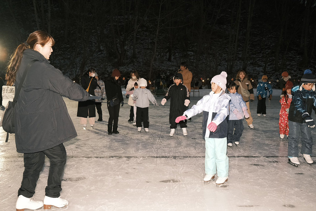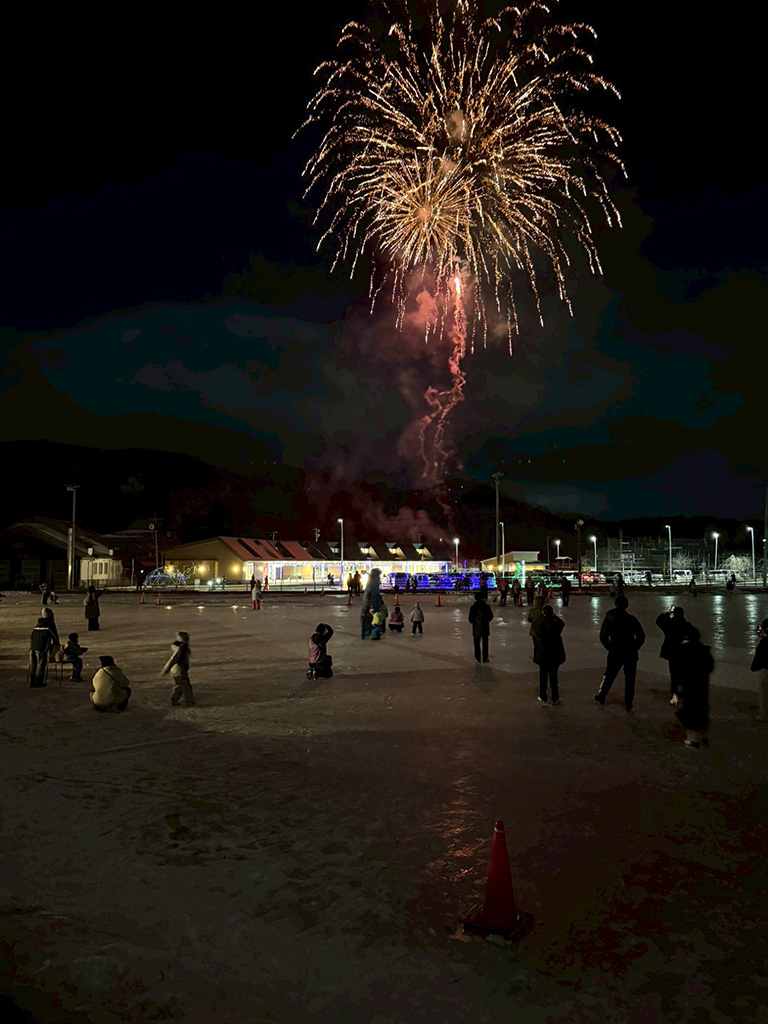 1月31日(土)に、氷祭と題して山木屋スケート場を活用した交流事業を開催いたしました。当日は、町内外から多くの方々が参加し、山木屋太鼓なども披露され、山木屋の魅力を知っていただく機会に繋がったものと思います。また、スケート教室においては、フィギュアスケート講師による本格的な指導もあり、子供たちを中心に大変有意義な経験にもなっておりました。スケートの自由滑走の時間帯には、幅広い年代の方々がスケートを通して交流を深め、地域一体的なつながりが生まれていました。加えて、夜には打ち上げ花火を実施し、山木屋地域の夜空を彩りました。